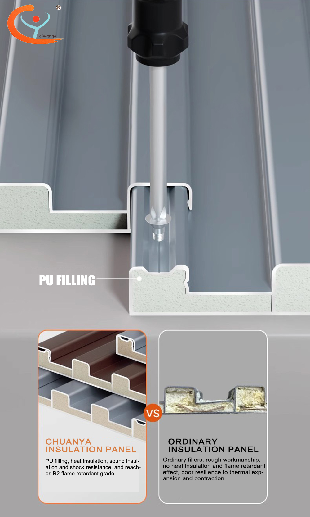 يتم ملؤها بمواد بوليمر عالية مثل البولي يوريثين أو البولي إيثيلين أو البولي يوريثين، ويتم ربطها معًا من خلال عملية مركبة خاصة لتحقيق العزل الحراري.